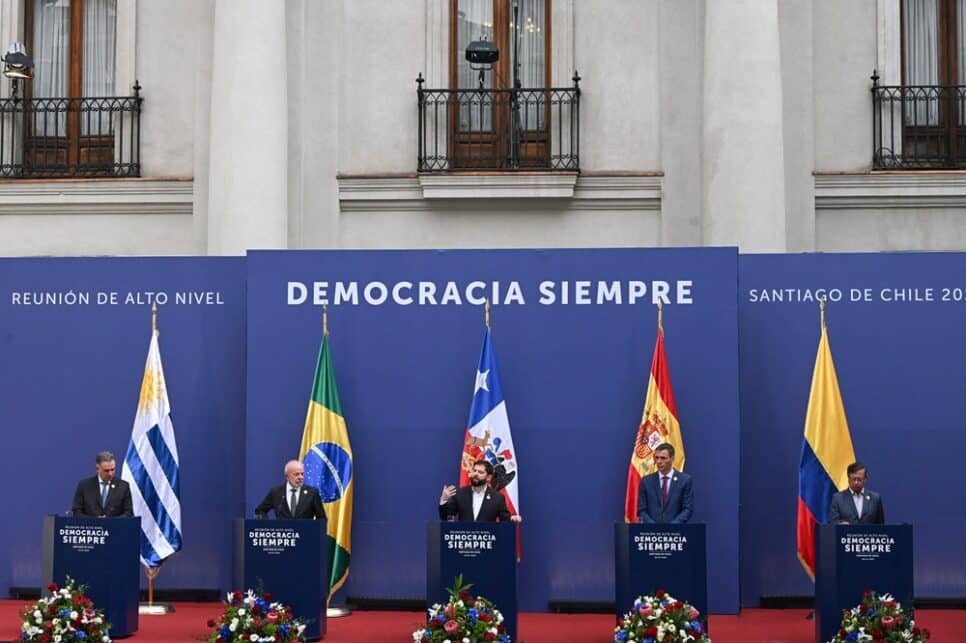 O presidente Luiz Inácio Lula da Silva afirmou, na segunda-feira (21), em encontro com líderes de esquerda da América do Sul e da Espanha, no Chile, que nações defensoras da democracia devem agir contra o “extremismo que tenta reeditar práticas intervencionistas”. A declaração é uma referência indireta à guerra tarifária e às sanções contra ministros do Supremo Tribunal Federal (STF) impostas pelo governo Donald Trump ao Brasil. Participaram da reunião o primeiro-ministro espanhol, Pedro Sánchez, e os presidentes do Chile, Gabriel Boric, do Uruguai, Yamandú Orsi, e da Colômbia, Gustavo Petro.