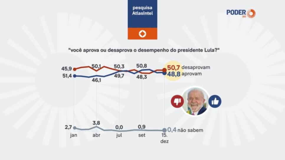 Uma pesquisa recente da AtlasIntel, em parceria com a Bloomberg, divulgada nesta quinta-feira (18 de dezembro de 2025), revela que 48,8% dos eleitores brasileiros expressaram aprovação no desempenho do presidente Luiz Inácio Lula da Silva. Em contrapartida, 50,7% declararam desaprovação, enquanto 0,4% não souberam ou não quiseram opinar.