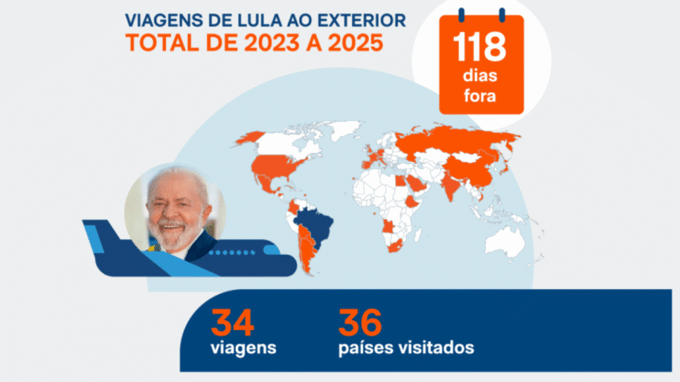 Ao término da viagem, Lula terá permanecido 118 dias fora do Brasil. Em 2025, o petista realizou 10 viagens internacionais, passou 30 dias fora e visitou 11 países distintos.