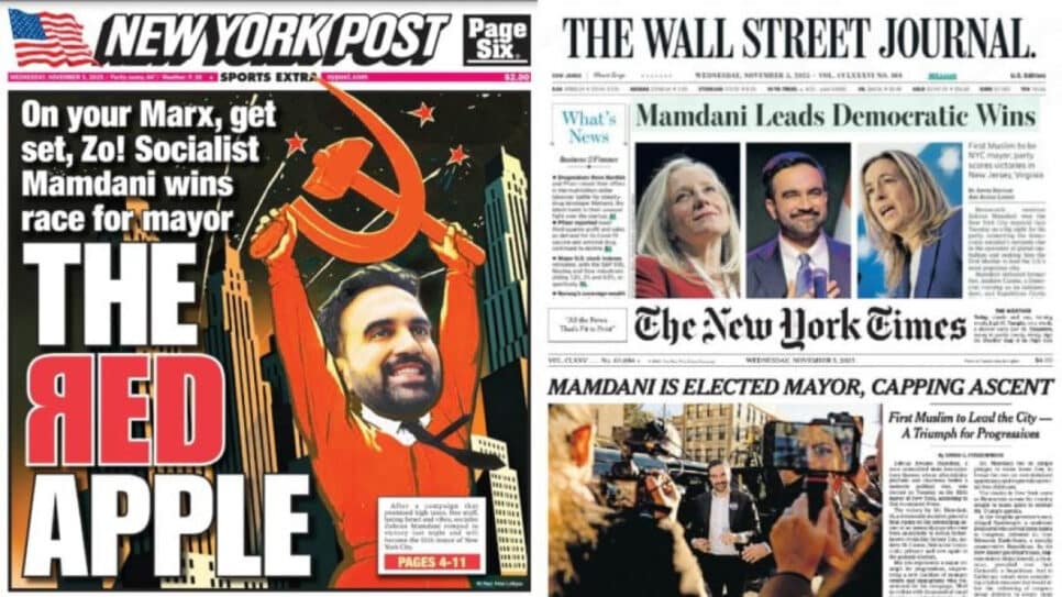 O New York Times enfatizou que Mamdani é o mais jovem prefeito de Nova York em 100 anos, o 2º prefeito socialista-democrata da cidade e o 1º prefeito da geração millennial. O New York Post, com a capa “The Red Apple”, ressaltou a alusão ao apelido da cidade e a plataforma de campanha de Mamdani, que incluía propostas como a criação de creches e supermercados públicos, transportes gratuitos e o congelamento no preço dos aluguéis, além da aproximação com os sindicatos.