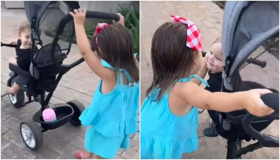Maria Flor é vista em vídeo nos stories do Instagram empurrando o carrinho de bebê do irmãozinho.