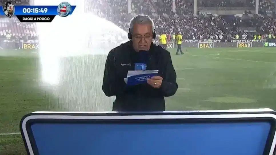 O renomado jornalista esportivo Mauro Naves teve um momento inusitado durante a cobertura do jogo entre Vasco e Bahia, válido pelo Brasileirão. O incidente ocorreu logo antes do apito inicial, quando um jato de água inesperadamente o atingiu.
