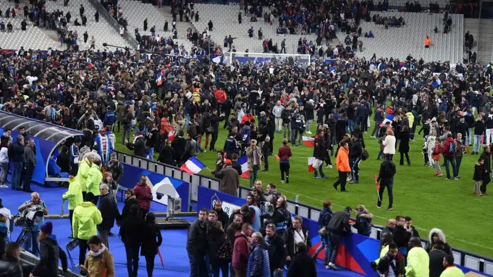 Naquele dia, a França enfrentava a Alemanha quando um homem-bomba detonou explosivos perto do Portão D do Stade de France, resultando na morte de um pedestre. O então presidente François Hollande estava presente no amistoso. O Estado Islâmico assumiu a responsabilidade pelos ataques.