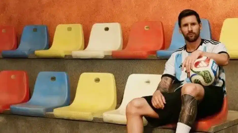 A imagem mostra o astro argentino vestindo a camisa da seleção, segurando a Trionda e apoiando a Al Rihla, a bola utilizada na Copa do Mundo conquistada em 2022. Ao lado, estão a taça do torneio e as chuteiras douradas que ele usou na vitória.
