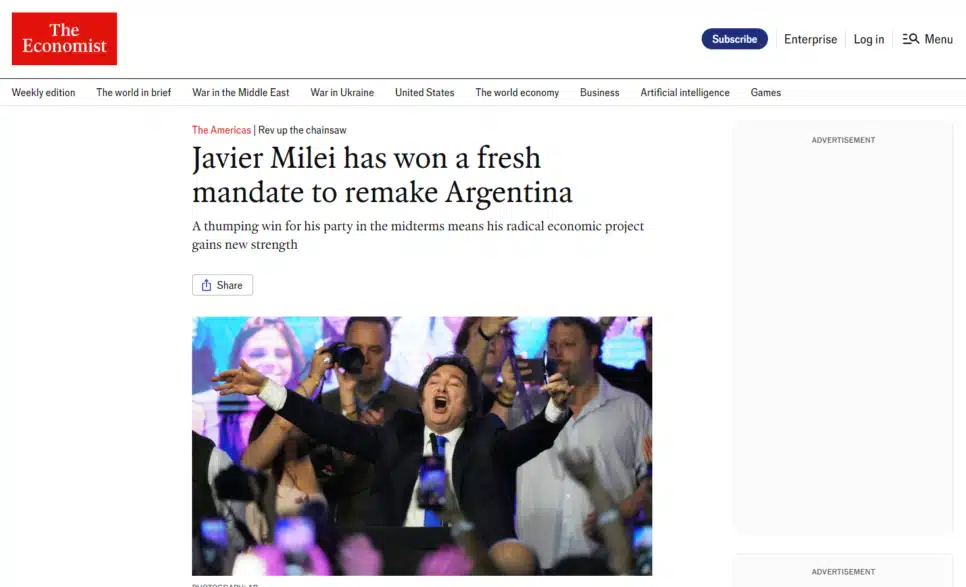 O partido La Libertad Avanza, liderado pelo presidente argentino Javier Milei, conquistou as eleições legislativas de meio de mandato no último domingo (26). De acordo com o The Economist, a vitória de Milei, que obteve 41% dos votos, foi considerada “estrondosa”, superando as previsões de analistas e do mercado que esperavam um empate ou uma vitória modesta.