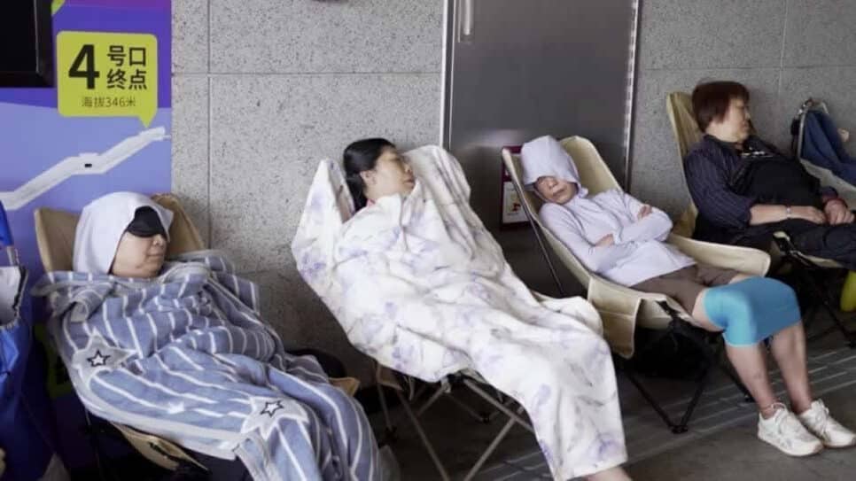 Na estação de metrô Hongyancun, as pessoas se reuniram para se refrescar do calor intenso, conversando, cochilando e jogando cartas no ambiente climatizado.