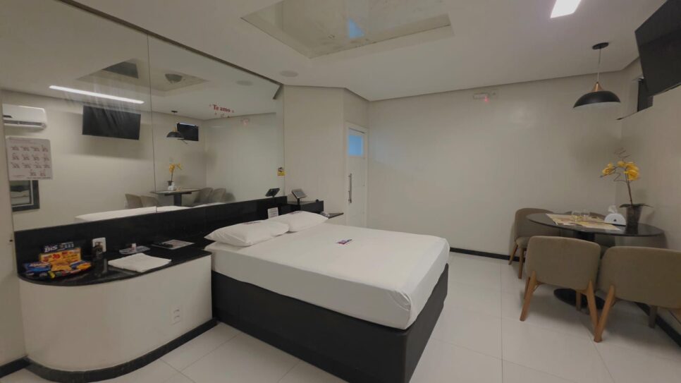 O quarto já inclui cama de casal, frigobar, banheiro, mesa e cadeira. Para a COP30, realizei o investimento em armário para roupas, televisão e kits novos de lençóis e utensílios para refeições. A cadeira erótica, comum em nossos estabelecimentos, ficará a critério do hóspede.