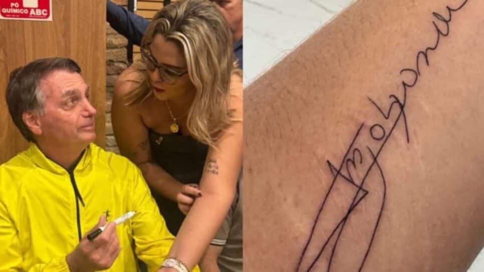 A mulher, que se identifica como ativista política nas redes sociais, compartilhou o registro e afirmou que “carregar a assinatura” de Bolsonaro é uma “honra”.
