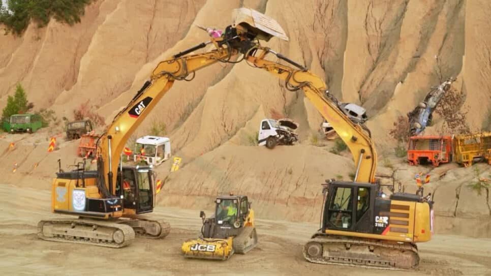 Uma pedreira de calcário desativada na zona rural da Estônia oferece um cenário enquanto diversos veículos, incluindo ônibus urbanos, caminhões de bombeiros, um caminhão de carga e um caminhão de cimento com cores vibrantes, passam por arquibancadas montadas.