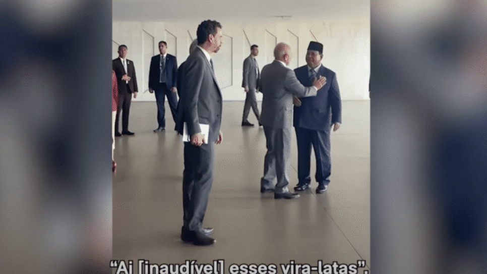 Ao ouvir a pergunta ao marido, Janja vira-se e sai andando. Rapidamente volta-se para a direção inicial e caminha em direção ao presidente, que está abraçando o presidente da Indonésia, Prabowo Subianto.