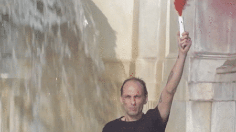 Ativistas do Greenpeace na Itália realizaram um protesto na sexta-feira (6.jun.2025) com faixas vermelhas na Fontana dell’Acqua Paola, em Roma, contra o envolvimento italiano no conflito em Gaza.