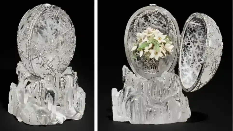Este Ovo de Inverno já estabeleceu recordes de preço em leilões anteriores e será vendido pela terceira vez em um evento que contará com cerca de 50 obras criadas por Fabergé e sua equipe.