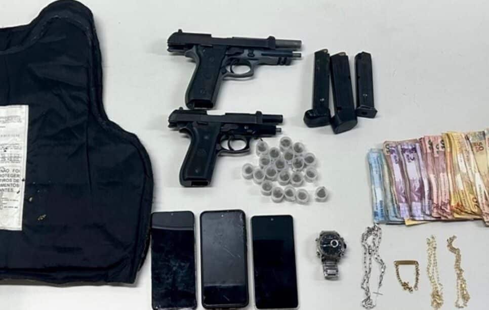 A PM apreendeu duas pistolas, munições, drogas, colete balístico, joias, celulares e dinheiro, que foram encaminhados à Delegacia de Homicídios e Proteção à Pessoa.