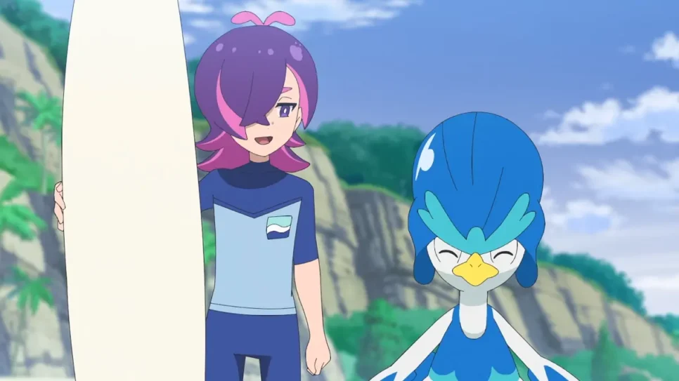 Durante a sessão de surfe, o grupo se depara com a presença de um Gholdengo, adicionando um elemento surpresa ao vídeo. A terceira temporada da série, ambientada um ano após os acontecimentos em Laqua, apresenta Liko e Rain envolvidas em uma nova aventura.