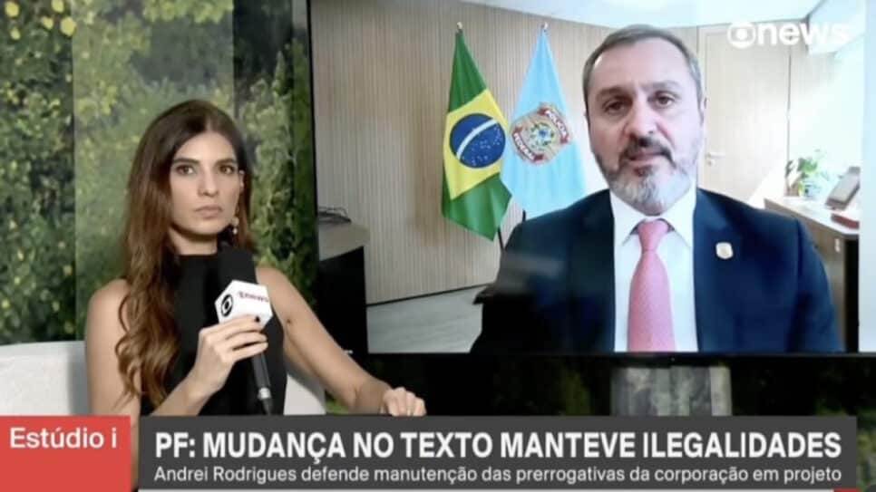 A postagem mostra Andrei Rodrigues, em um momento de conversa com Andréia Sadi, criticando as limitações impostas pelo projeto à atuação da Polícia Federal no combate ao crime organizado.