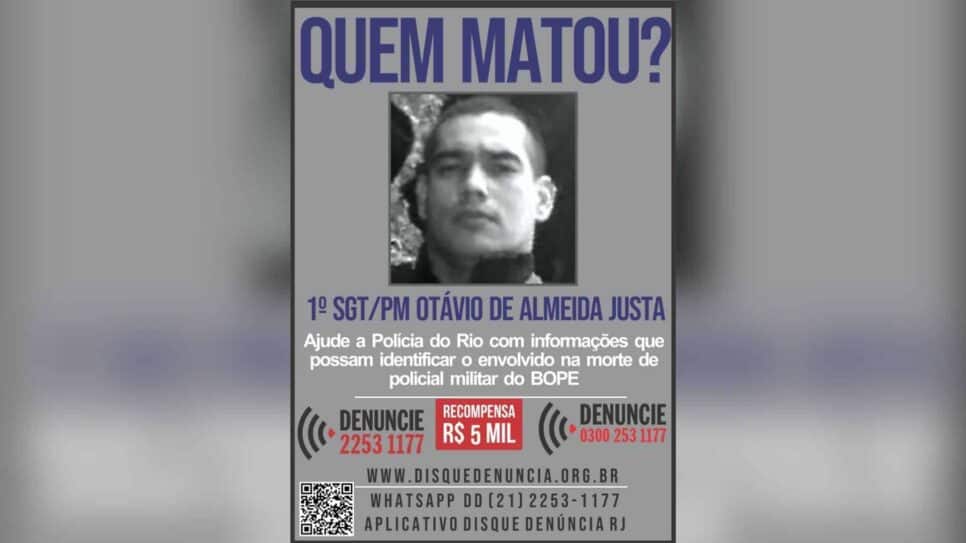 O Disque Denúncia divulgou, neste domingo (8), um cartaz solicitando informações que auxiliem na identificação e localização do indivíduo envolvido na morte do 1º sargento Otávio de Almeida Justa, também conhecido como Caveira 153, do Batalhão de Operações Especiais (BOPE) da Polícia Militar do Rio de Janeiro.