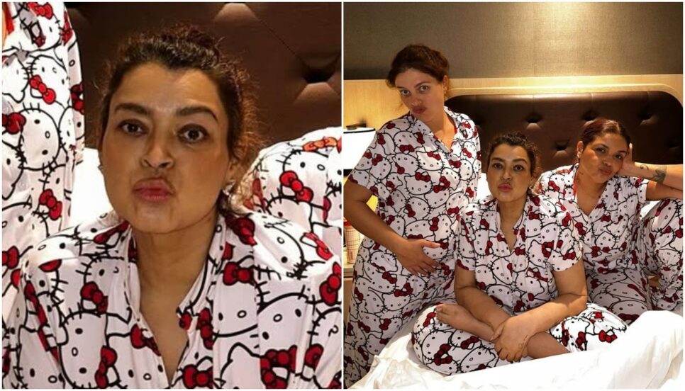 As três, que são amigas inseparáveis há anos, posaram para um clique usando pijamas iguais, temáticos da personagem Hello Kitty.
