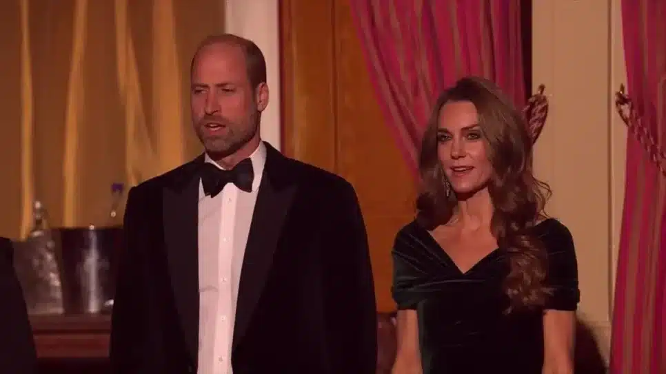 Kate estava deslumbrante em um vestido longo de veludo verde, enquanto o príncipe William optou por um terno e gravata preta. A cantora britânica Katherine Jenkins deu início ao evento com a execução do Hino Nacional, e o casal foi visto cantando junto.