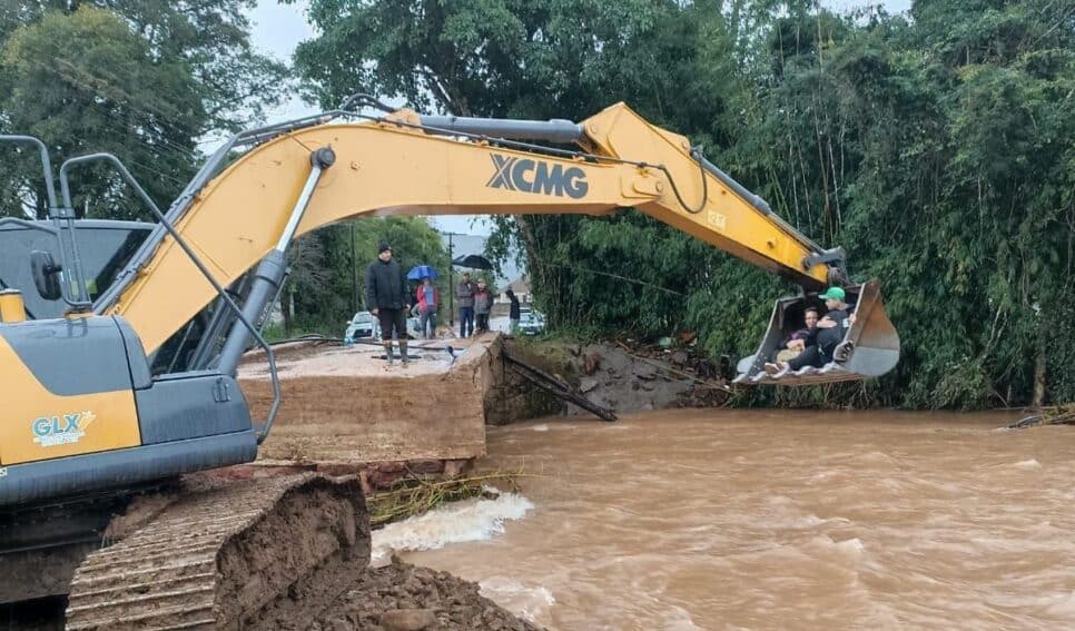 Em Paraíso do Sul, na Região Central, ocorreu um resgate surpreendente, capturado em fotos e vídeos. As imagens mostram duas pessoas dentro da cabine de uma escavadeira hidráulica.