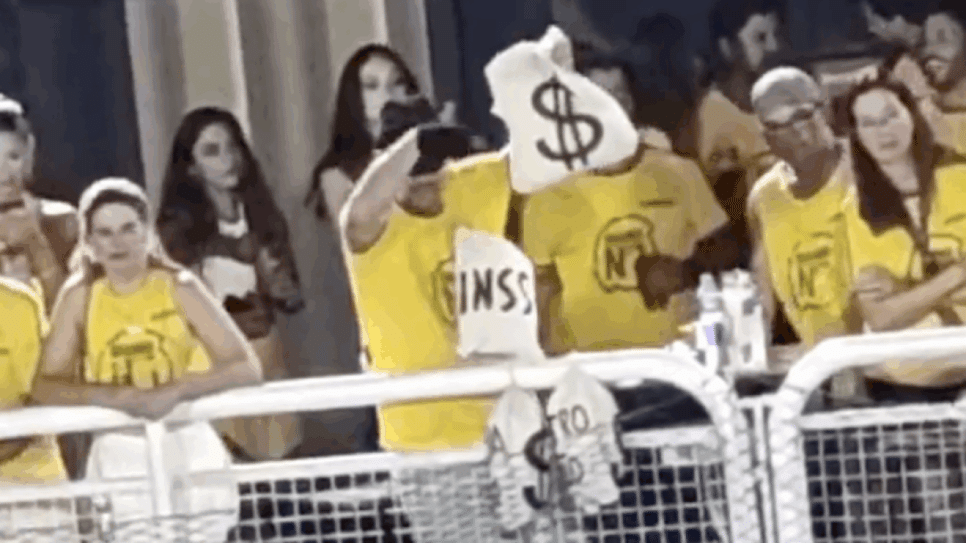 O manifestante, vestido com uma fantasia de “ladrão” e carregando sacos que simulavam dinheiro, além de adesivos do Instituto Nacional do Seguro Social (INSS), fez referência aos pagamentos de aposentadorias e pensões da instituição. A manifestação ocorreu em meio ao desfile da escola de samba, que homenageava o presidente Lula.