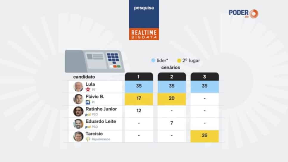 Uma pesquisa em tempo real, divulgada nesta quarta-feira, 17 de dezembro de 2025, pelo Poder360, aponta que, considerando uma eleição presidencial hoje, o Partido dos Trabalhistas (PT) lideraria com 35% das intenções de voto. O segundo colocado seria o senador do Partido Liberal (PL) – Rio de Janeiro, com 17% das respostas.