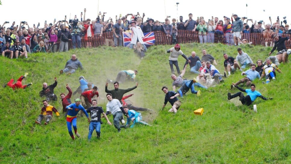 A regra é simples: correr atrás de um queijo Double Gloucester por uma colina de 200 metros, com inclinação média de 45 graus. O primeiro a atravessar a linha de chegada vence. O problema? A descida é tão íngreme que muitos desistem no último momento.
