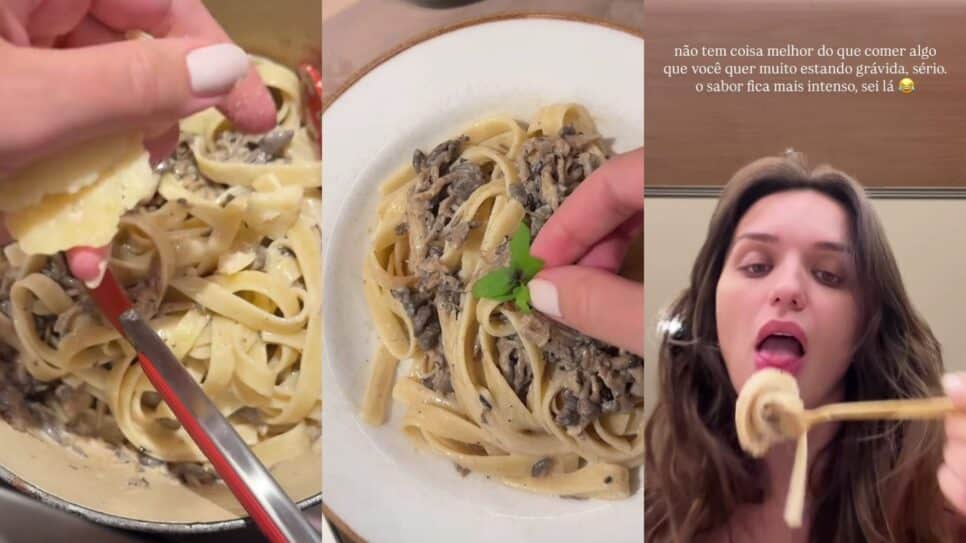 A influenciadora Rafa Kalimann exibiu nos Stories do Instagram o modo como preparou seu macarrão com cogumelos e trugas negras às 23h20: cozinhando! A gestante revelou a receita completa, que também continha queijo grana padano, entre outros ingredientes.