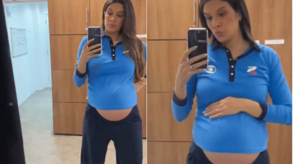 A narradora esportiva da Globo, Renata Silveira (35), mostrou com bom humor os desafios da gravidez avançada em seu ambiente de trabalho. Em um vídeo que viralizou nesta terça-feira (21), a jornalista destacou que o uniforme da emissora está visivelmente apertado, com a camisa polo não comportando mais a barriga.