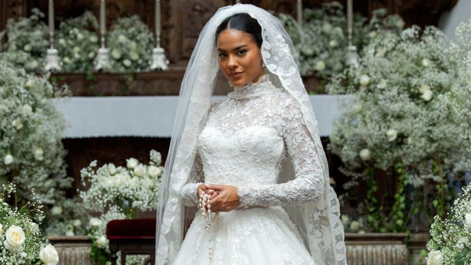 A renda é um símbolo de sofisticação e elegância na indústria da moda, e também se destaca em vestidos com mangas bufantes, longas e véu – uma metáfora visual para a ambição da personagem.