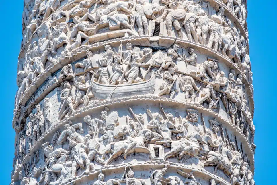 Os frisos em espiral que retratam as guerras do Império Romano sob Marco Aurélio envolvem o monumento 23 vezes, criando uma narrativa contínua do fundo ao topo.