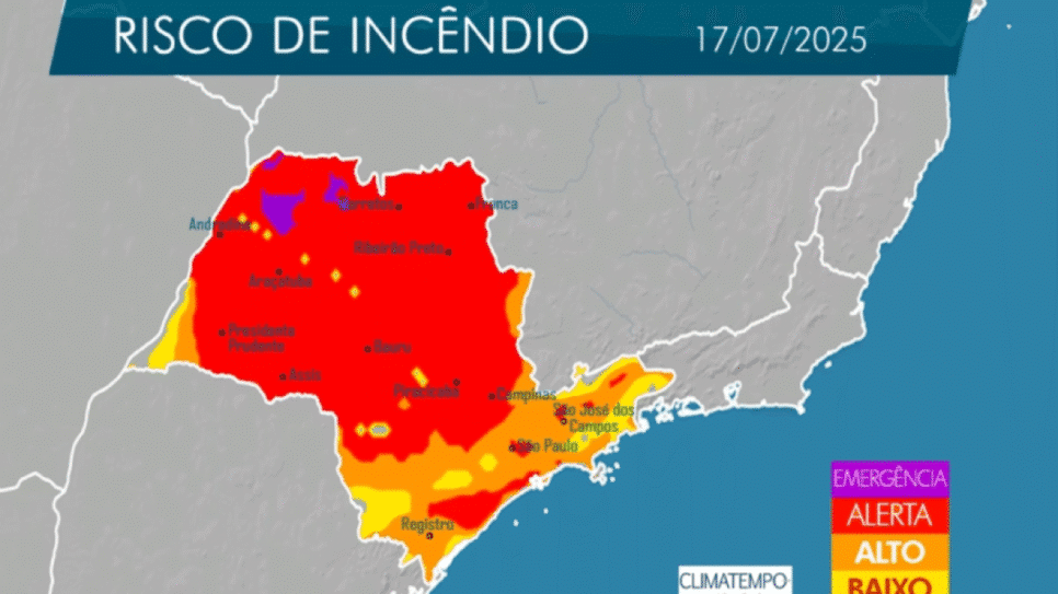 A região metropolitana de São Paulo foi colocada em estado de alerta para risco de incêndio nesta quarta-feira (16.jul.2025). Trata-se do primeiro alerta desse tipo em 2025, conforme mapas produzidos pela Defesa Civil do Estado.