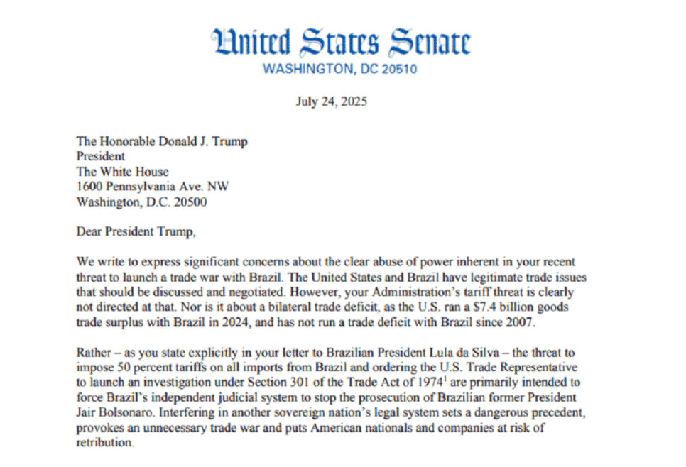O grupo adverte que a retaliação brasileira pode aumentar os custos de produtos para famílias americanas, uma vez que os EUA importam mais de 40 bilhões de dólares por ano do Brasil – incluindo quase 2 bilhões de dólares em café – e que o comércio bilateral sustenta cerca de 130 mil empregos nos Estados Unidos. Os senadores criticam o uso da economia americana “em favor de um amigo”, em referência a Bolsonaro, e avaliam que a postura de Trump enfraquece a influência dos EUA no Brasil e favorece a aproximação do país com a China. “Uma guerra comercial com o Brasil também aproximaria o país da República Popular da China em um momento em que os EUA precisam combater agressivamente a influência chinesa na América Latina”, afirma o texto.
