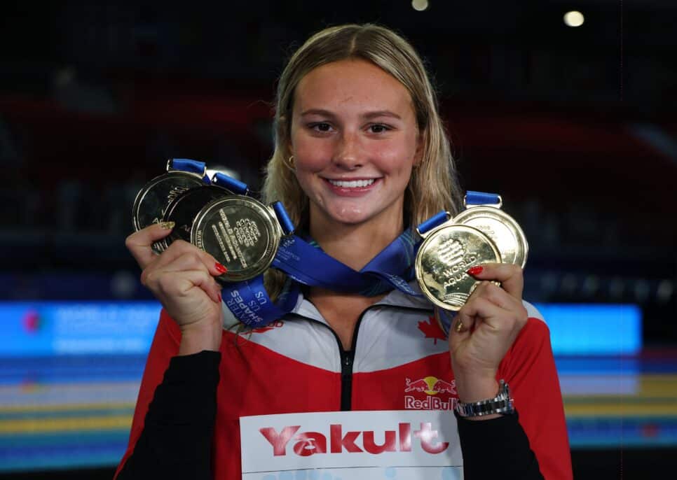 A adolescente canadense finalizou a prova em 4:25,78, registrando um novo recorde do campeonato e finalizando uma participação quase perfeita com cinco medalhas em suas competições.