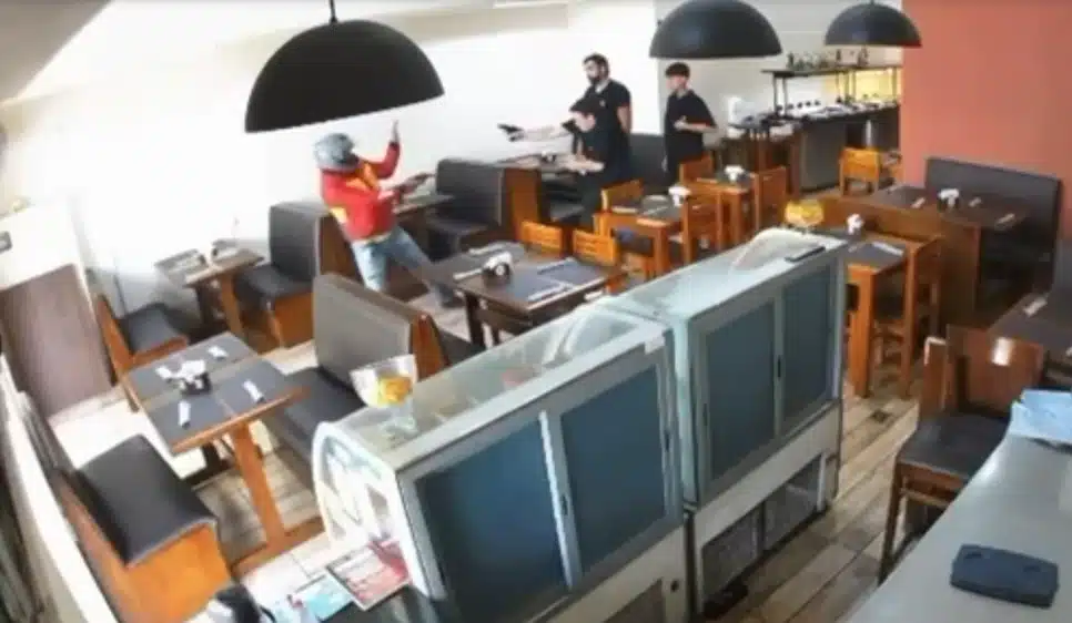 Durante a ação criminosa, um policial civil que estava no local reagiu e disparou contra o assaltante. Um funcionário do restaurante também ficou ferido no confronto. Imagens de câmeras de segurança registraram o momento em que o criminoso chega ao local, estaciona a moto e anuncia o assalto.