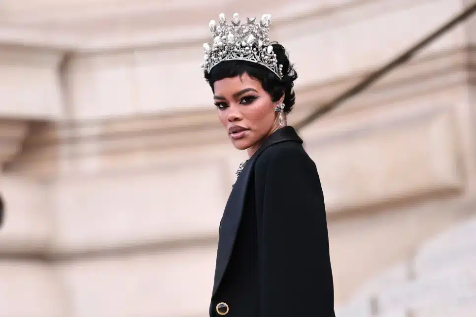 Além da coroa, o colar que a atriz usou apresenta um laço de strass, semelhante ao acessório que ela exibiu em outra ocasião. Para completar o visual, Teyana escolheu um look totalmente preto, composto por uma blusa, uma saia de renda e detalhes em transparência.