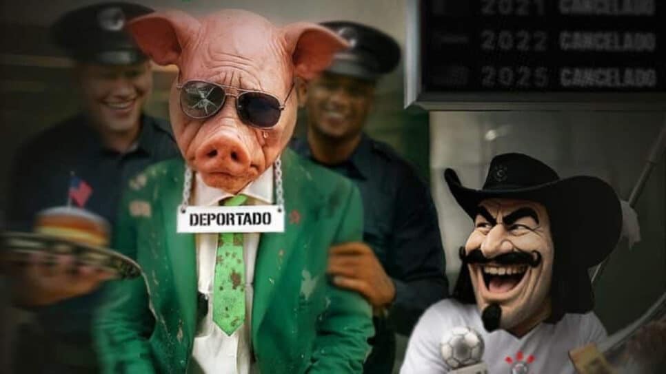 O Corinthians aproveitou sua conta nas redes sociais na sexta-feira (4.jul.2025) para fazer piada com a eliminação do Palmeiras na Copa do Mundo de Clubes. A foto apresenta o mascote do clube rival sendo conduzido por autoridades americanas com um colar no pescoço e a legenda “deportado”.