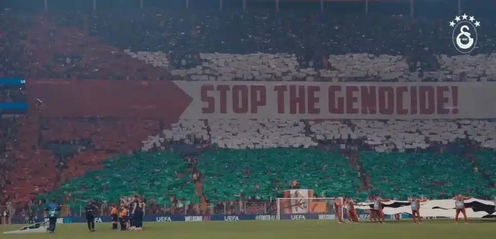 Os torcedores levantaram um mosaico da bandeira da Palestina e exibiram um cartaz com a mensagem “Pare o Genocídio!” em inglês, demonstrando sua solidariedade com a causa palestina.