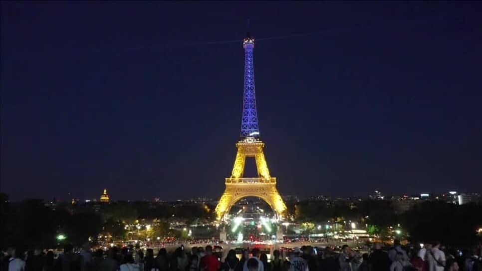 A Torre Eiffel foi iluminada com as cores da bandeira da Ucrânia, no domingo (24), em celebração ao Dia da Independência, o 34º aniversário da proclamação da independência de Kiev da União Soviética.