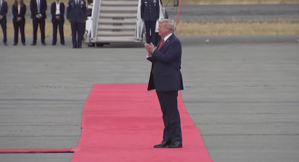 Trump desceu primeiro e esperou em um local determinado para a chegada de Putin, evidenciando um suposto equilíbrio de poder entre os dois países.