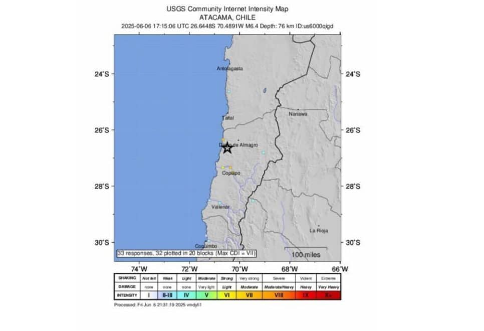 Um terremoto de magnitude 6,4 foi registrado na sexta-feira (6) na região do Atacama, no norte do Chile, sem deixar vítimas, porém afetando o serviço elétrico e causando pequenos deslizamentos de terra, conforme informações oficiais. O sismo ocorreu às 13h15 locais (14h15 de Brasília), a 54 quilômetros ao sul da cidade de Diego de Almagro, e apresentou uma magnitude de 6,4, de acordo com o Centro Sismológico Nacional.