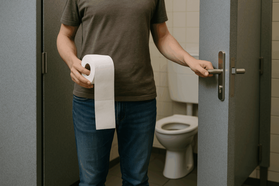 Não apenas o assento representa risco. O manuseio de papel higiênico, maçanetas e torneiras pode disseminar germes. Portanto, a proteção deve ser abrangente.