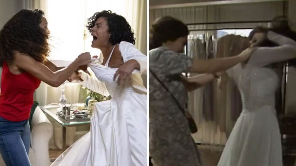 “A sorte não é do Ivan de não ter que viver o resto da vida com uma mulher ridícula igual a você, cheirando a gordura”, gritou Fátima. Raquel, então, não se segura e distribui vários tapas na vilã ambiciosa.