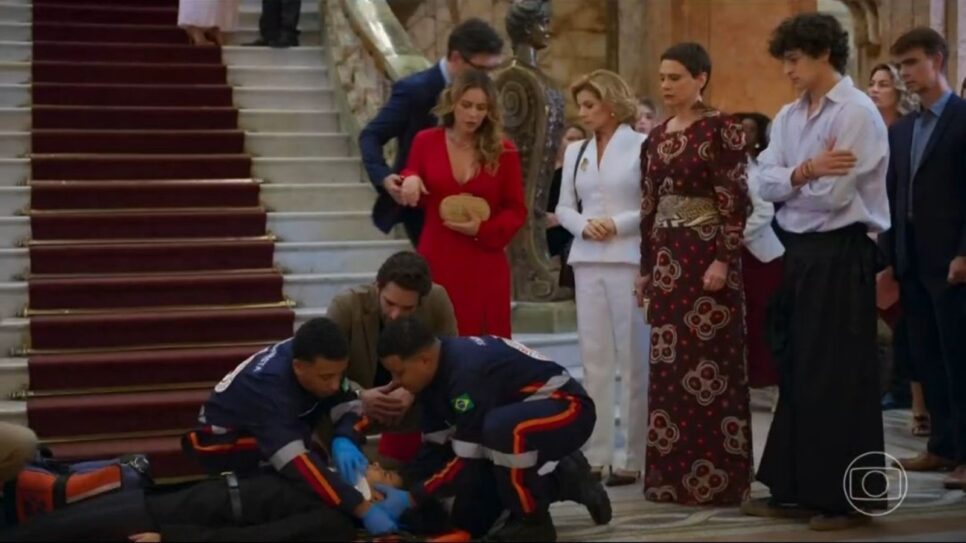 Ela saltou das escadarias do Theatro Municipal do Rio de Janeiro, buscando interromper a concepção e evitar o nascimento do bebê. A cena era uma das mais esperadas na adaptação de Manuela Dias.
