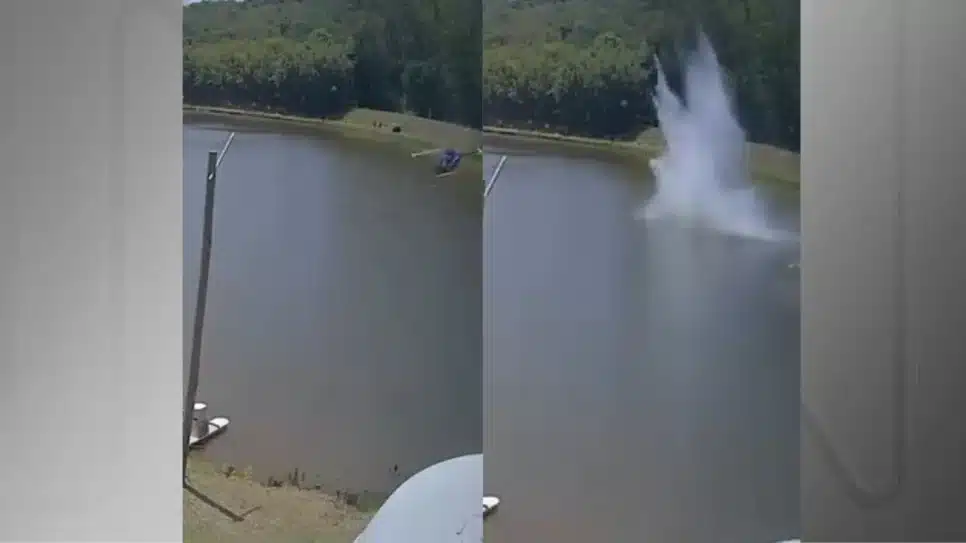 Imagens de uma câmera de segurança capturaram o momento em que um helicóptero caiu em um lago pesqueiro na Estrada do Vinho, em São Roque, interior de São Paulo, no início da tarde deste domingo (26).
