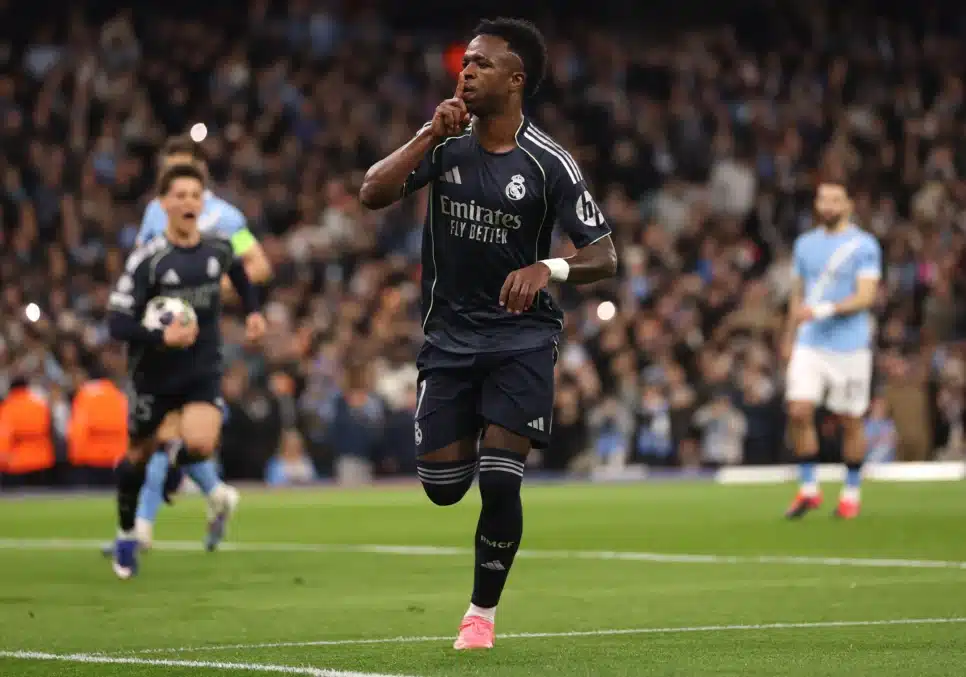 O atacante brasileiro Vinícius Júnior abriu o placar para o Real Madrid na partida de volta das oitavas de final da Champions League, realizada no Etihad Stadium, contra o Manchester City. O gol foi anotado de pênalti.