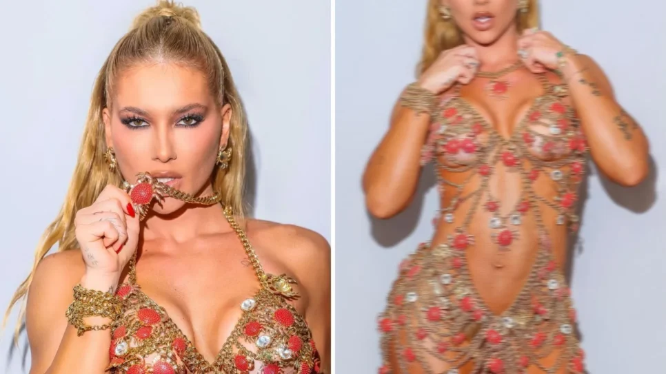 A influenciadora Virginia, de 26 anos, esteve presente no ensaio de quadra da escola de samba Acadêmicos do Grande Rio, realizado na noite da última terça-feira (11) em Duque de Caxias. Para a ocasião, ela escolheu um vestido impressionante que pesava nove quilos, feito com 60 metros de correntes banhadas a ouro.
